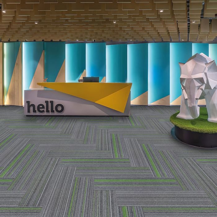 Transform your interiors with Linear Green Carpet Tiles. Designed with a 1/10″ level loop pile and cushioned backing, these tiles combine durability, comfort, and style. Their subtle linear streaks and easy glue-down installation make them ideal for offices, lobbies, and other modern commercial spaces.